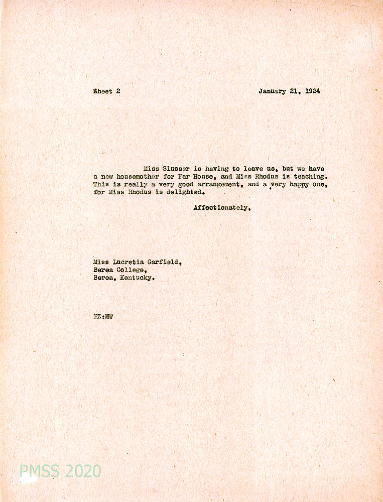066-066a January 14, 1923. Handwritten two-page letter to Mrs. Zande from Lucretia, “en route to Cincinnati,” who [006] asks to take patrol leaders to the Harlan Co. Girls’ Rally, which would include Martha Shoope, [006a] Fair Anna Harris, Allie Callahan from PMSS and Clara Callahan, Bessie Shields from Line Fork and one girl from Big Laurel.