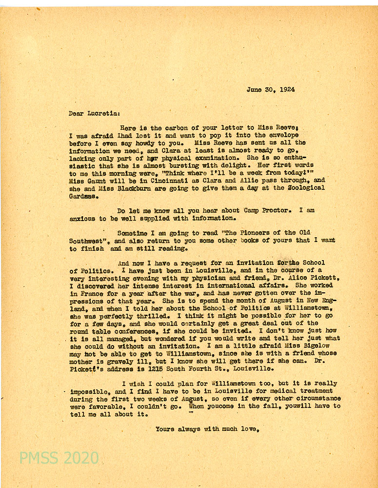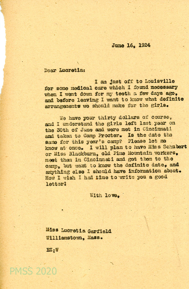 096 June 16, 1924. To Lucretia in Williamstown, MA, from EZ. Asked about the plans to get the Girl Scouts to Camp Procter. Miss Schubert or Miss Blackburn, old PMSS workers, will meet them in Cincinnati.