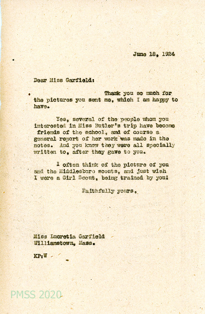 097 June 18, 1924. To Miss Garfield from KP, who thanks her for the picture. Indicates that Lucretia interested several people in helping fund Miss Butler’s trip.