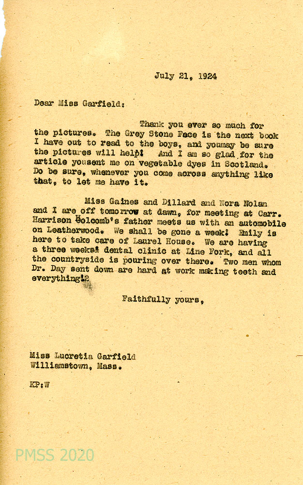 100 July 21, 1924. To Miss Garfield from KP. Thanks her for sending pictures and an article on vegetable dyes in Scotland. Miss Gaines, Dillard, Nora Nolan and KP will attend a meeting at Carr; a dental clinic is at Line Fork for three weeks.