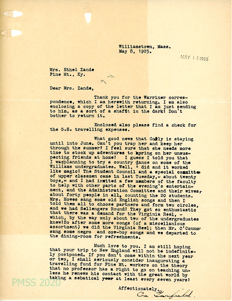 106 May 8, 1925. Typewritten letter to Mrs. Zande from Cre Garfield, who thanks her for the Warriner correspondence. Tells about a country dance that she had for Williams undergraduates.