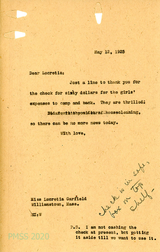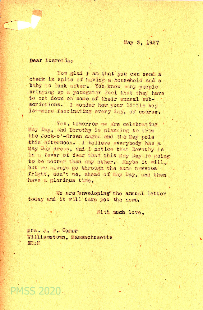 075 May 16, 1923. To Lucretia in Williamstown, MA, from [unsigned]. Send the $30 to Miss Gaines who is managing the girls who are going to camp; thanks Lucretia for $5 from donor; not sure of the benefit PMSS will receive from the Robinson Fund. “As you know, I went to St. Louis the minute school closed and brought back a lovely little four months old girl. She is very very good, and adds vastly to the happiness of our household.” Thanks Lucretia for the books she sent.