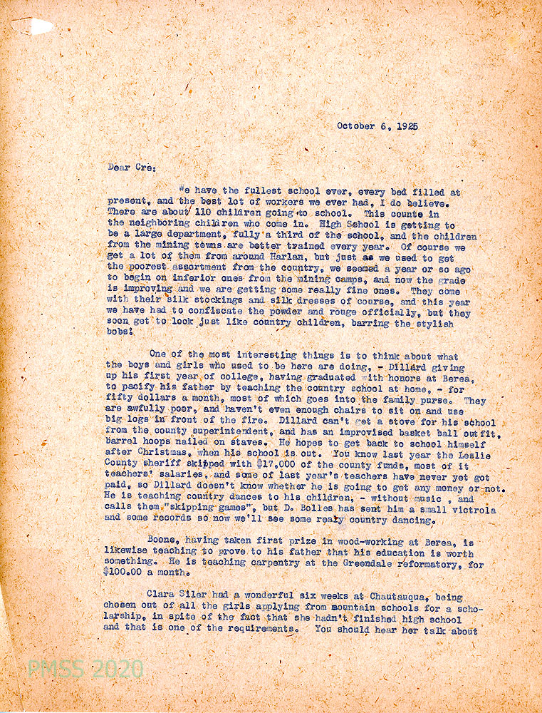 110-110a-110b October 6, 1925. Three-page letter to Cre from [unsigned, likely EZ]. [110] Tells of “the fullest school ever” with about 110 children; high school is “a third of the school” and the quality of the students from mining towns and Harlan is improving. “They come with their silk stockings and silk dresses of course, and this year we have had to confiscate the powder and rouge officially, but they soon get to look just like country children, barring the stylish bobs!” EZ writes about what some of the PMSS graduates are now doing: Dillard, Boone, Clara Siler, [110a]