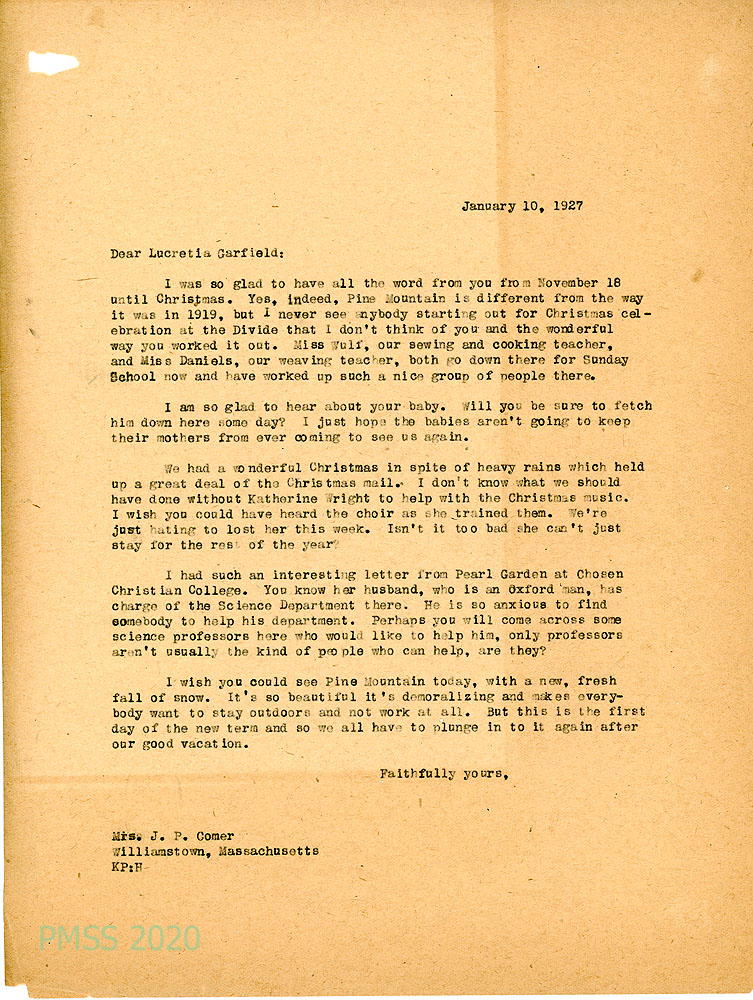 120 January 10, 1927. To Lucretia Garfield from KP. Praised the work that Lucretia did at the Divide. Miss [Anna] Wulf, sewing and cooking teacher, and Miss [Florence] Daniels, weaving teacher, are teaching Sunday School there now. At Christmas, Katherine Wright helped with the music, training the choir. She left this week [after 3 months at PMSS]. Received a letter from Pearl Garden at Chosen Christian College, whose husband, a science professor at Oxford, is looking for an assistant. Describes snow at PMSS.