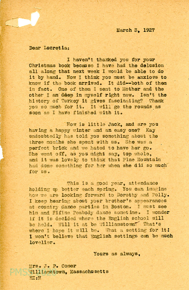 121 March 3, 1927. To Lucretia from EZ, who thanked her for the Christmas books. Looking forward to Dorothy and Polly. EZ heard about Lucretia’s brother at country dance parties in Boston.