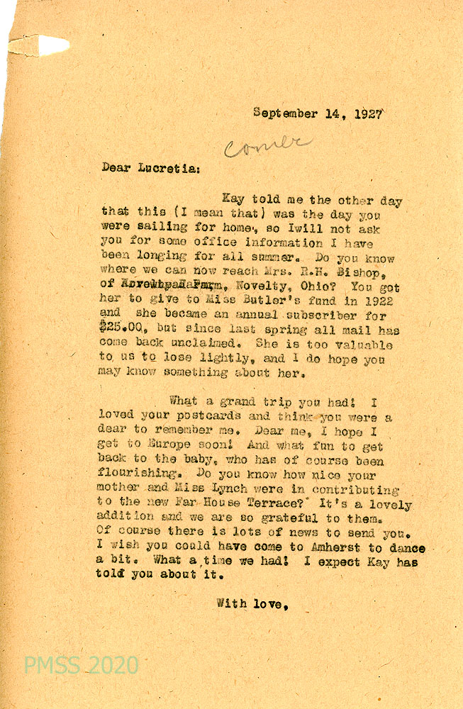 123 September 14, 1927. To Lucretia from [unsigned]. Asked for the address of a donor, Mrs. R.H. Bishop. Thanks Lucretia for the postcards of her trip. Lucretia’s mother and Miss Flinch contributed to the new Far House Terrace.