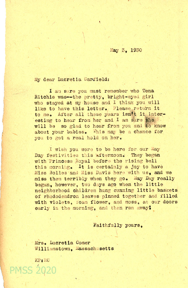 124 May 3, 1930. To “My dear Lucretia Garfield” from KP. Encloses a letter from Tena Ritchie. Describes May Day and help from Miss [Dorothy] Bolles and Miss Davis.
