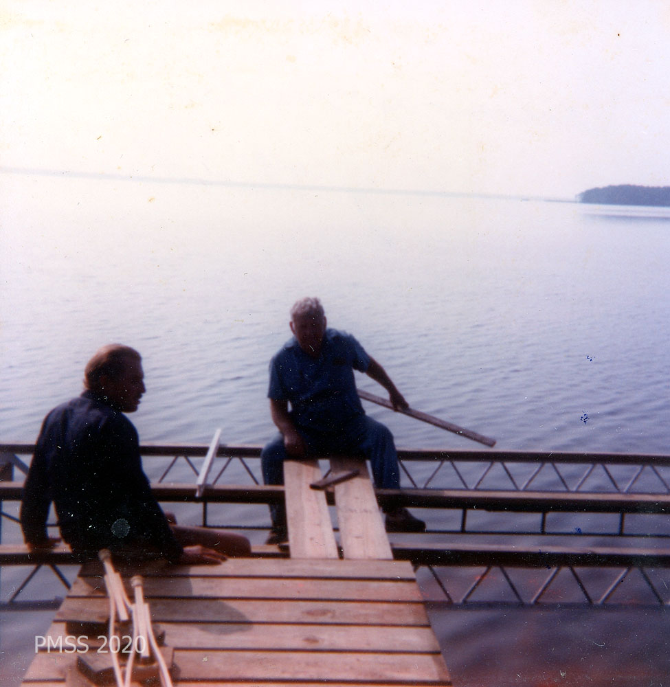 - Junior [E.C Hall II] and Mike building the dock.” Photo in letter from Enoch C. Hall II to his mother, Myrtle Hall 1984. [hall_enoch_III_letter_005]