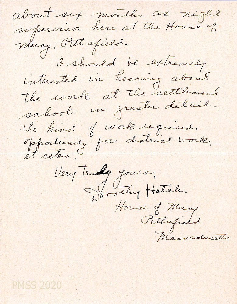 003-003a August 11, 1921. Two-page handwritten letter to Zande from Dorothy Hatch, House of Mercy, Pittsfield, MA, responding to the advertisement in The Outlook. She is a registered nurse (NY), graduate of United Hospital, Port Chester, NY, 1920. She describes her experiences and asks for more information about PMSS.