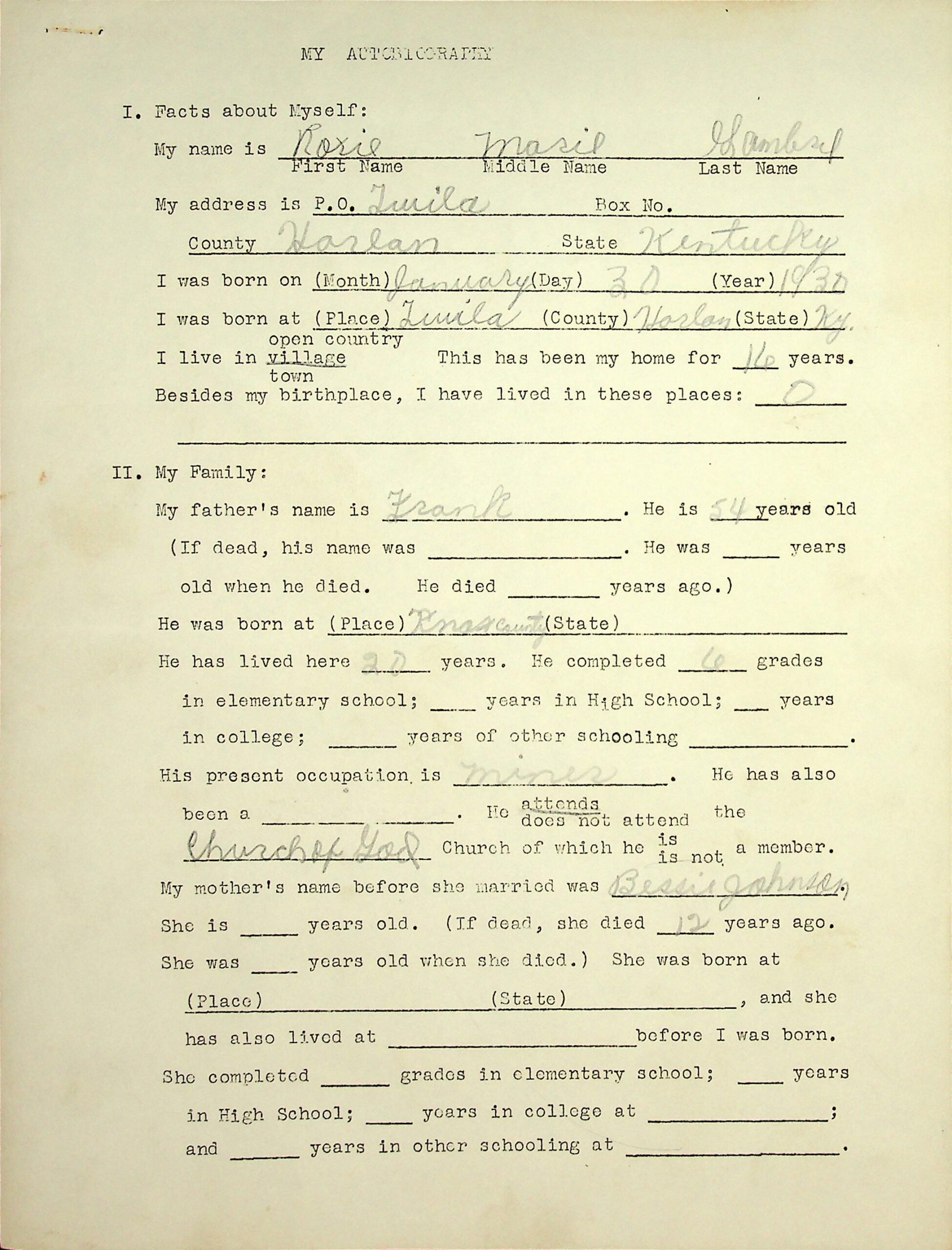 01 February 27, 1946. MY AUTOBIOGRAPHY – Roxie Marie Gambrel, Twila, Harlan County, Kentucky. Born: January 30, 1930, in Twila, KY. Father: 54 years old; born in Knox County; a miner…. Mother: Bessie Johnson, who died 12 years ago.