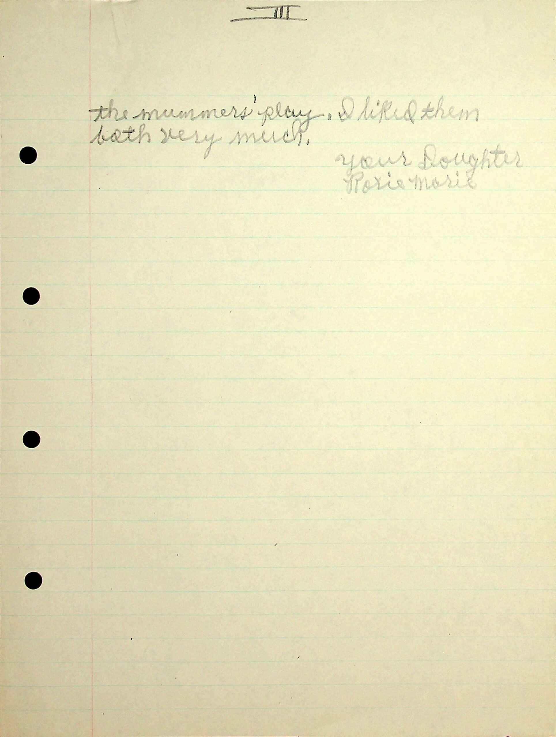 06-10 December 19, 1946. Handwritten five-page letter to “Mother & Daddy” (Mr. and Mrs. Frank Gambrel, Twila, KY), from “Your Daughter, Roxie Gambrel.” [06] “At the end of the term we are supposed to write a letter home telling how we have done this term.” She describes her progress in her hardest subjects: math, [07] science. Other subjects: Bible, English (“I have learned to use English better since I came [08] over here….”), and civics. She tells about her progress in work, [09] living in Big Log, leisure time, table manners (“I learned to take three bits of the food that I don’t like and I have learned to like a lot more food such as greens….” [10] Favorite event: the Mummers’ Play. She learned to use the sewing machine in home economics. “Well, I will close now as I have to make two more copies of this letter.”