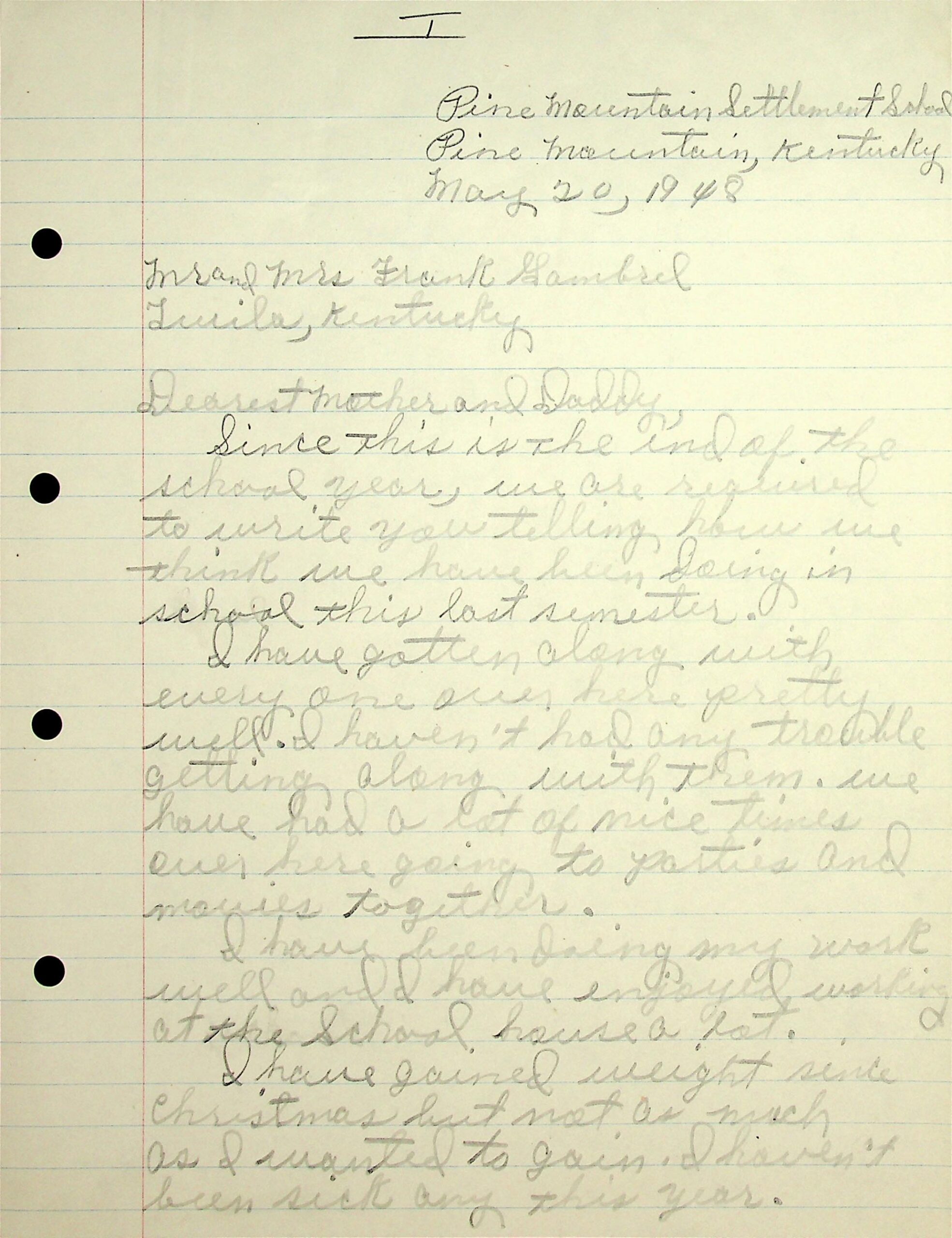 14-16 May 20, 1948, Handwritten three-page letter to “Mother & Daddy” (Mr. and Mrs. Frank Gambrel, Twila, KY), from “Your Daughter, Roxie Gambrel.” [14] Describes getting along with others (“…going to parties and movies together.”), her work at the School House, weight gain, [15] and health. Tells about: economics, English, and teachers. (“They are the kind of teachers I should have had all through grade school. Then maybe I would have a little more education that I have now. But it is my fault that I didn’t study.”). “I don’t do very well in math or co-op.” Tells about “a nice little church over here,” [16] with chapel services in which the students participate.