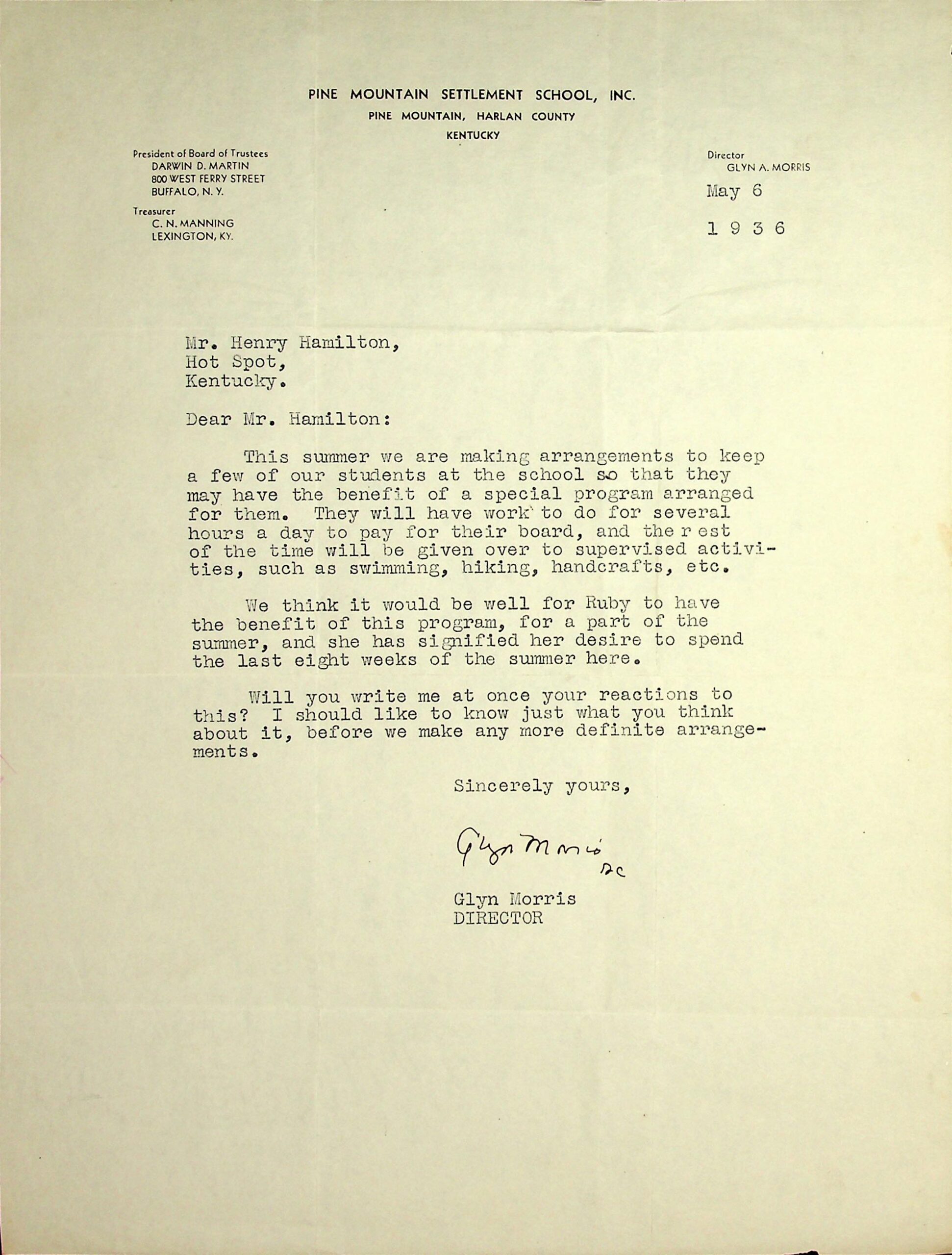 12 May 2, 1935. To Glyn Morris, PMSS [director], from Ruby Hamilton, Hot Spot, Ky., asking to be admitted into PMSS. She is 15 years old and in the eighth grade. “I want to work my way through if you allow it.”