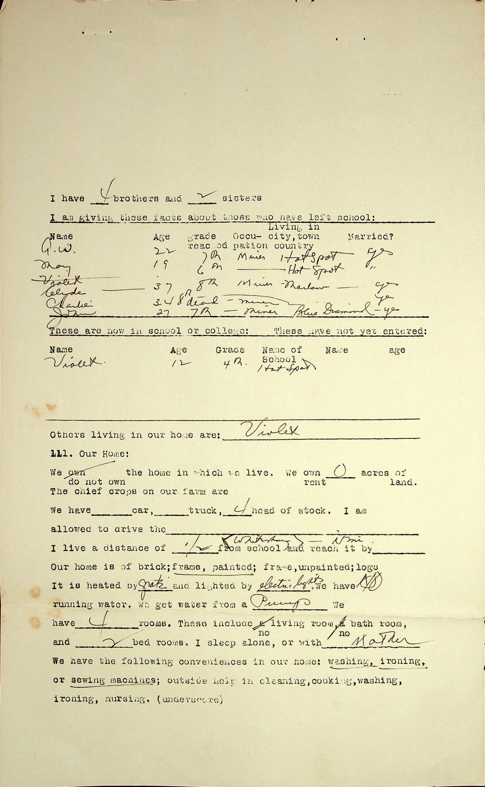 02 I have 4 brothers, all are married and work as miners: A.W. (age 22), Clyde (37), Charles (29 when he died), John (27). I have two sisters: Mae and Violet (age 12, 4th grade at Hot Spot School). Description of home.