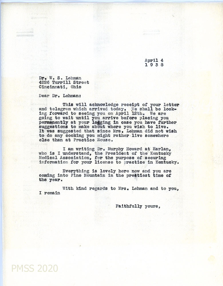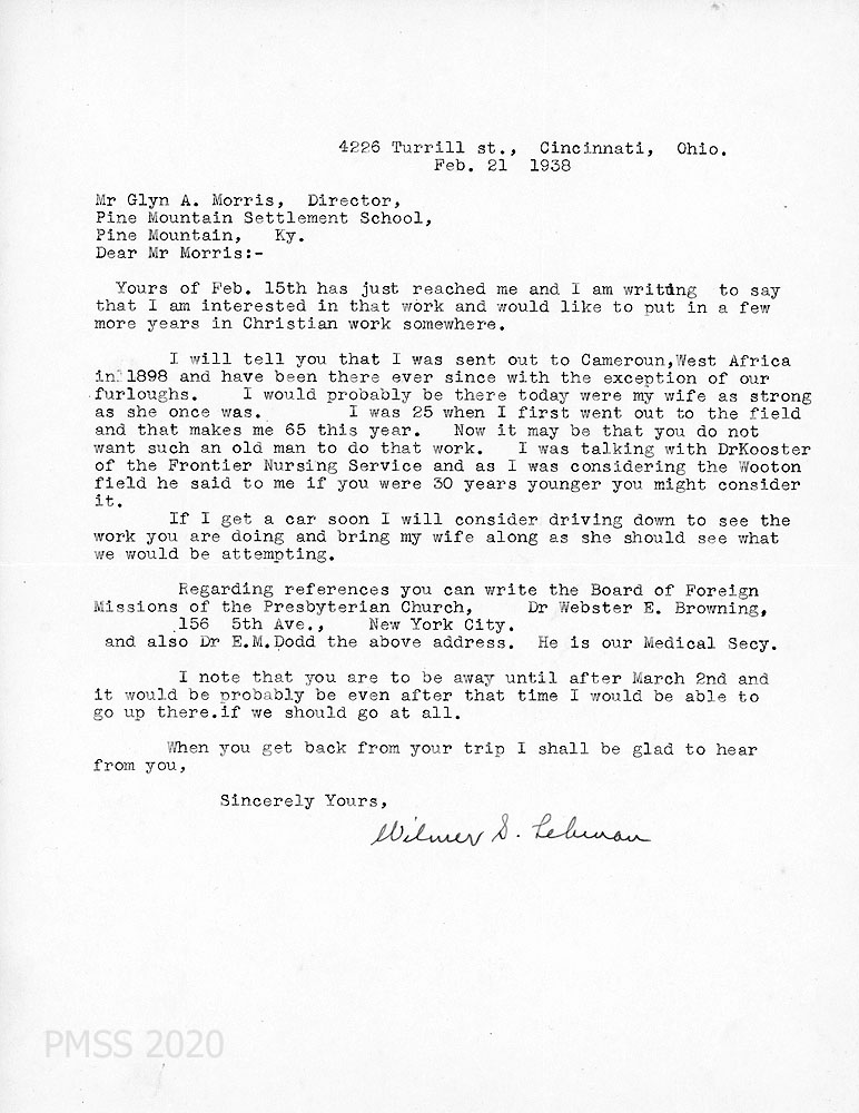 [001] [001a] February 15, 1938. To Dr. W.S. Lehman, Cincinnati, OH, from [unsigned, likely Glyn A. Morris, Director]. [001]. Informed by “Miss Anna M. Scott, Secretary for Personnel Service, Department of Missionary Operation of the Board of National Missions of the Presbyterian” that Lehman is interested in “doing medical work in the mountains,” he tells Lehman that the School is currently looking for a physician for the School and “our scattered community.” Morris encloses literature; describes the Infirmary which has seven beds, a trained nurse in charge and a small operating room. Describes the School’s location; medical service in the surrounding community; “nurse aide” program; former health association; salary of $150 including maintenance (housing, board, laundry, heat and light) and one month vacation with salary; traveling is done by car and occasionally by horseback. [001a] Lehman, if interested, should send names of references and arrange a possible visit.