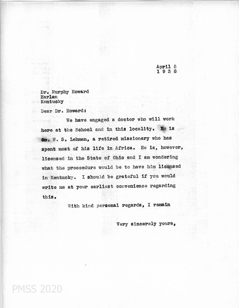 [016] April 5, 1938. To Dr. Murphy Howard, Harlan, KY, from [unsigned] asking about the procedure to have Lehman licensed in Kentucky.