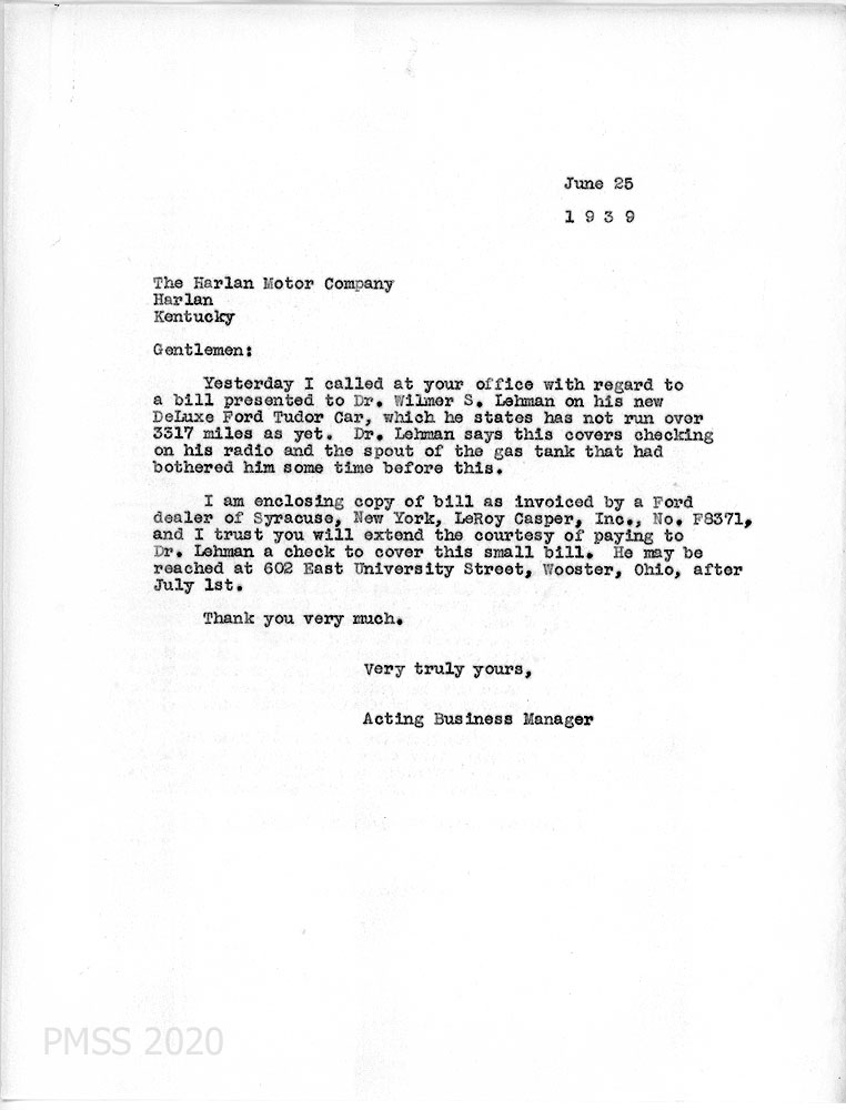[023] June 25, 1939. To “Gentlemen” at the Harlan Motor Company from [unsigned, likely Ayers], Acting Business Manager, who encloses a bill from a Ford dealer in Syracuse, NY, and asks that payment is sent to Lehman.