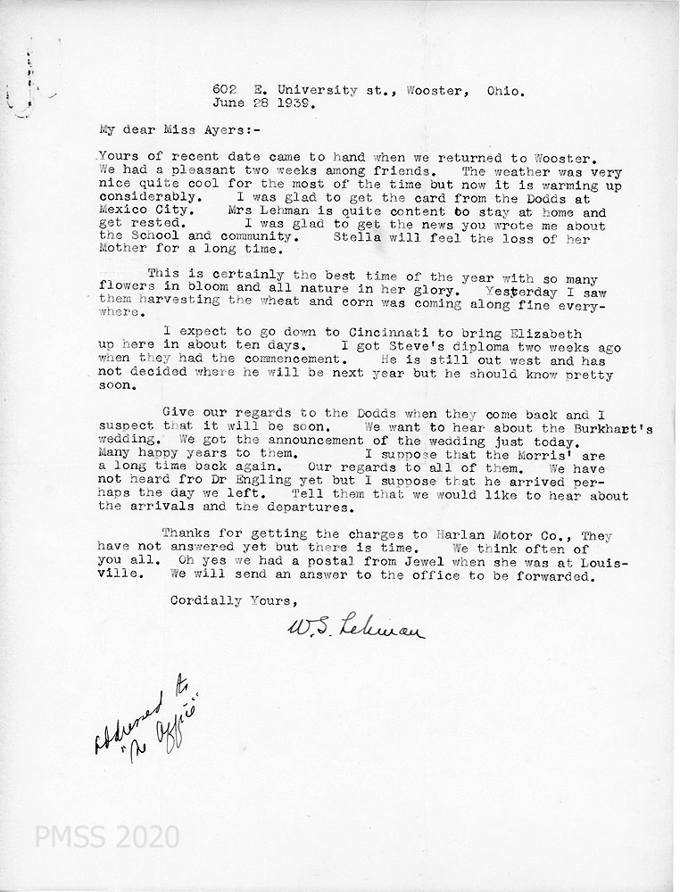 [024] June 28, 1939. Typewritten letter to Miss Ayers from Lehman in Wooster, who had just spent two weeks with friends in Syracuse; received a card from Dodds in Mexico City; Mrs. Lehman is resting; will bring Elizabeth back from Cincinnati; received Steve’s diploma; asks about the Burkhart’s wedding; heard from Jewel.
