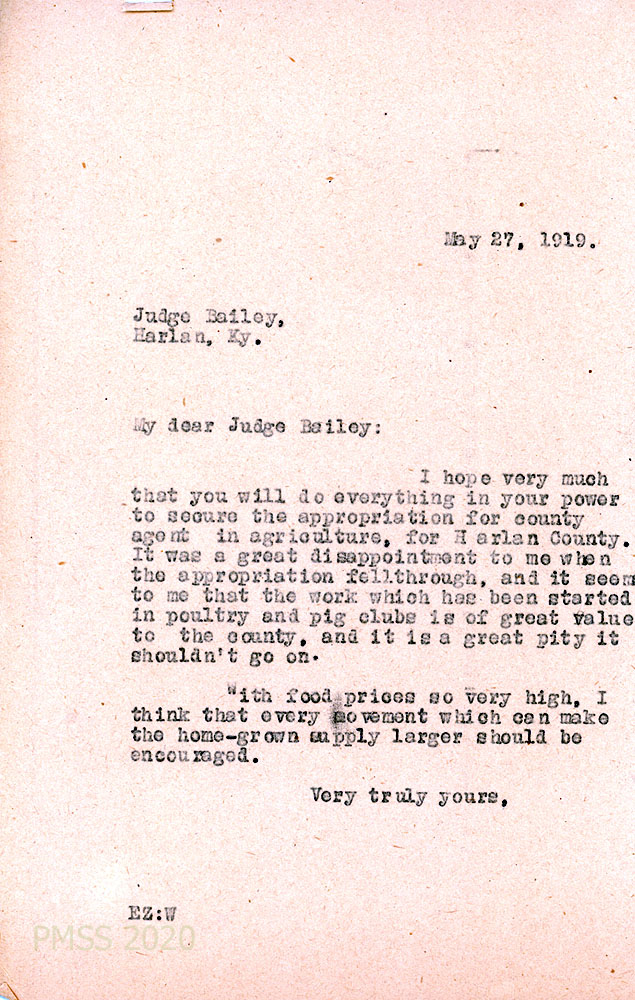 [001] May 27, 1919. To Judge Bailey, Harlan, Ky, from EZ (Ethel de Long). “I hope very much that you will do everything in your power to secure the appropriation for county agent in agriculture, for Harlan County. … With food prices so very high, I think that every movement which can make the home-grown supply larger should be encouraged.”