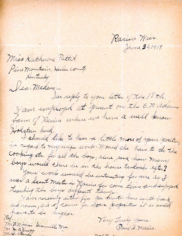 [002] June 18, 1919. To Mr. Paul S. Mabie, Evansville, Wisconsin, from [truncated, likely Katherine Pettit]. In response to an ad in Hoard’s Dairyman, in which he is looking for work, she encloses a booklet and describes “what we are trying to do in this very remote section of the Kentucky Mountains.” Tells about the need to hire a married couple to live in the farmer’s house: A man to run the barn (with 9-10 cows), teach the school boys about “model dairy work” and the wife to care for the poultry yard (containing about 500 White Leghorns and Plymouth Rocks), and serve as housekeeper/housemother the boys in Farmhouse. She describes the school staff (15-18 workers, all college graduates or professionally trained), the railroad, nearest town, and the approximately 80 students. “This is an industrial school where the children are learning everything about life in the country, from proper sanitation to good farming and carpentry work, and country school teaching. It is hard work, done under almost pioneer difficulties with the satisfaction of seeing results in the children….”