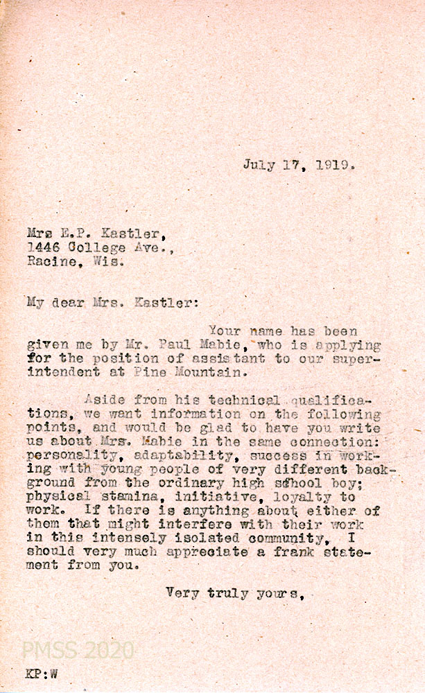 [006] July 17, 1919. To Mrs. E.P. Kastler, Racine, WI, from KP (Pettit), asking her for a statement about Mabie’s “personality, adaptability, success in working with young people of very different background from the ordinary high school boy; physical stamina, initiative, loyalty to work,” aside from his technical qualifications.