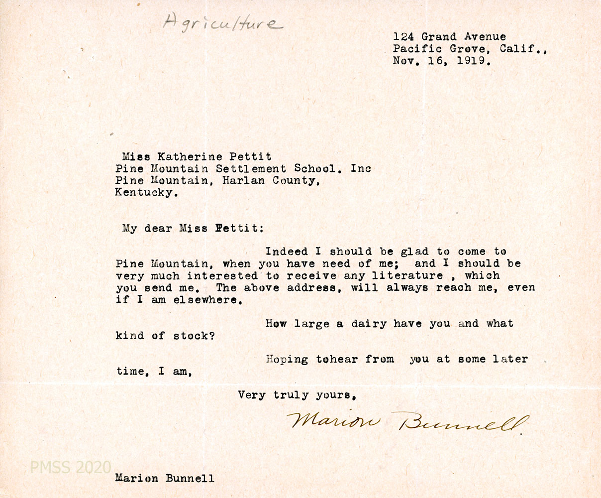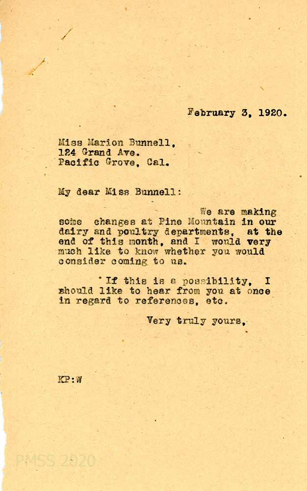 [009] November 16, 1919. To Pettit from Marion Bunnell, Pacific Grove, CA, stating that she “should be glad to come to Pine Mountain, when you have need of me….” and asks for information.
