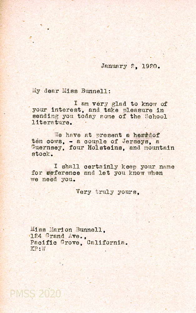 [010] January 2, 1920. To Bunnell from KP (Pettit), enclosing School literature and providing information about the School’s ten cows: “a couple of Jerseys, a Guernsey, four Holsteins, and mountain stock.” Pettit will keep her name on file.