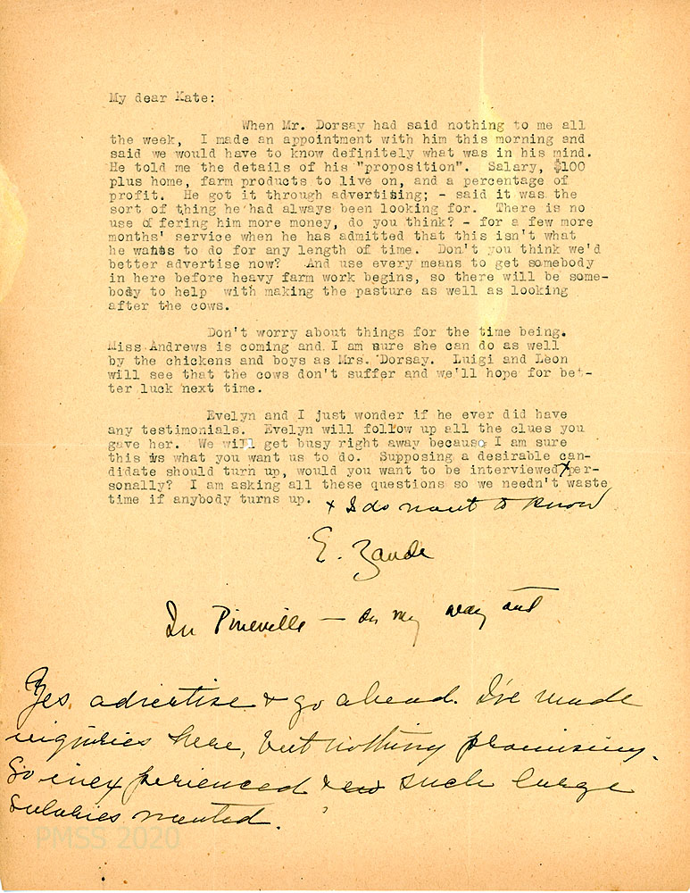 [012a] N.D. Reverse side of [012]. To “Kate” (Katherine Pettit) from “E. Zande,” reporting that, during a meeting with Mr. Dorsay, he described a position elsewhere that he is considering. She asks Pettit whether to advertise for someone else now “before heavy farm work begins, so there will be somebody to help with making the pasture as well as looking after the cows.” Meanwhile, Miss Andrews will be coming to PMSS to care for the chickens and boys. Luigi [Zande] and Leon [Deschamps] will care for the cows. Evelyn [Wells] will look into whether he had any “testimonials.” [Notation at bottom of page in Ethel de Long Zande‘s handwriting: “Yes, advertise & go ahead. I’ve made inquiries here, but nothing promising. So inexperienced & such large salaries wanted.”