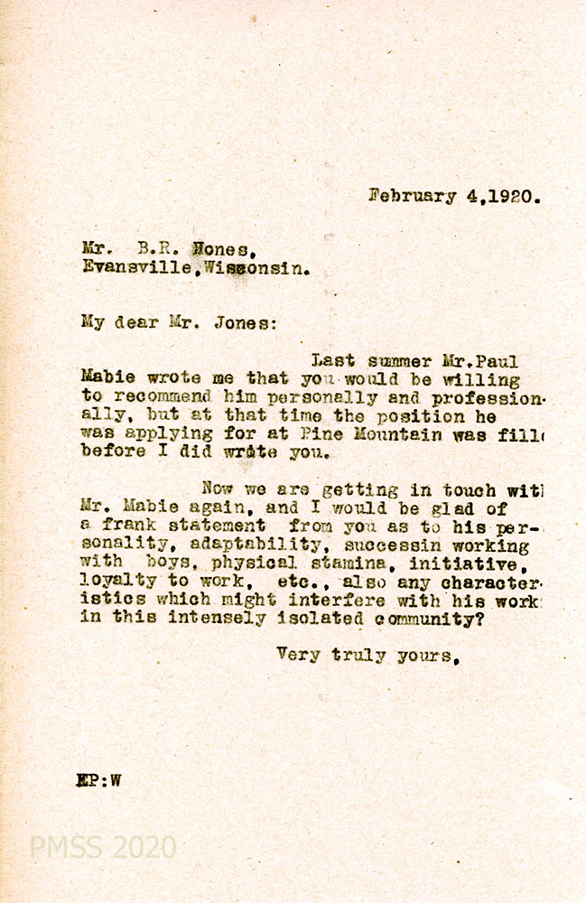 [015] February 4, 1920. To Mr. B.R. Hones, Evensville, WI, from KP (Pettit), requesting a statement concerning Mabie’s personal and professional characteristics.