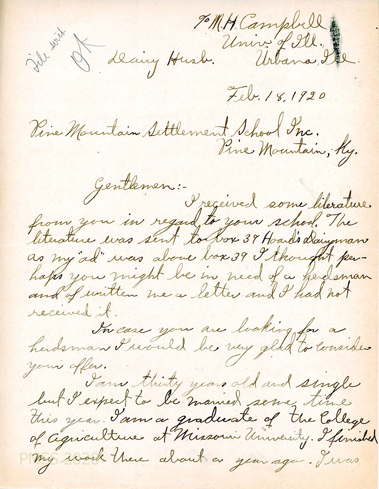 The following contents list and images of FARM AGRICULTURAL CORRESPONDENCE consist of letters between the School’s co-founders and applicants for the Assistant Farm Superintendent position at Pine Mountain Settlement School in 1919 and 1920. The correspondence provides a look at both the hiring practices of the School and the School’s fledgling dairy farm during the first decade of the School’s existence.
