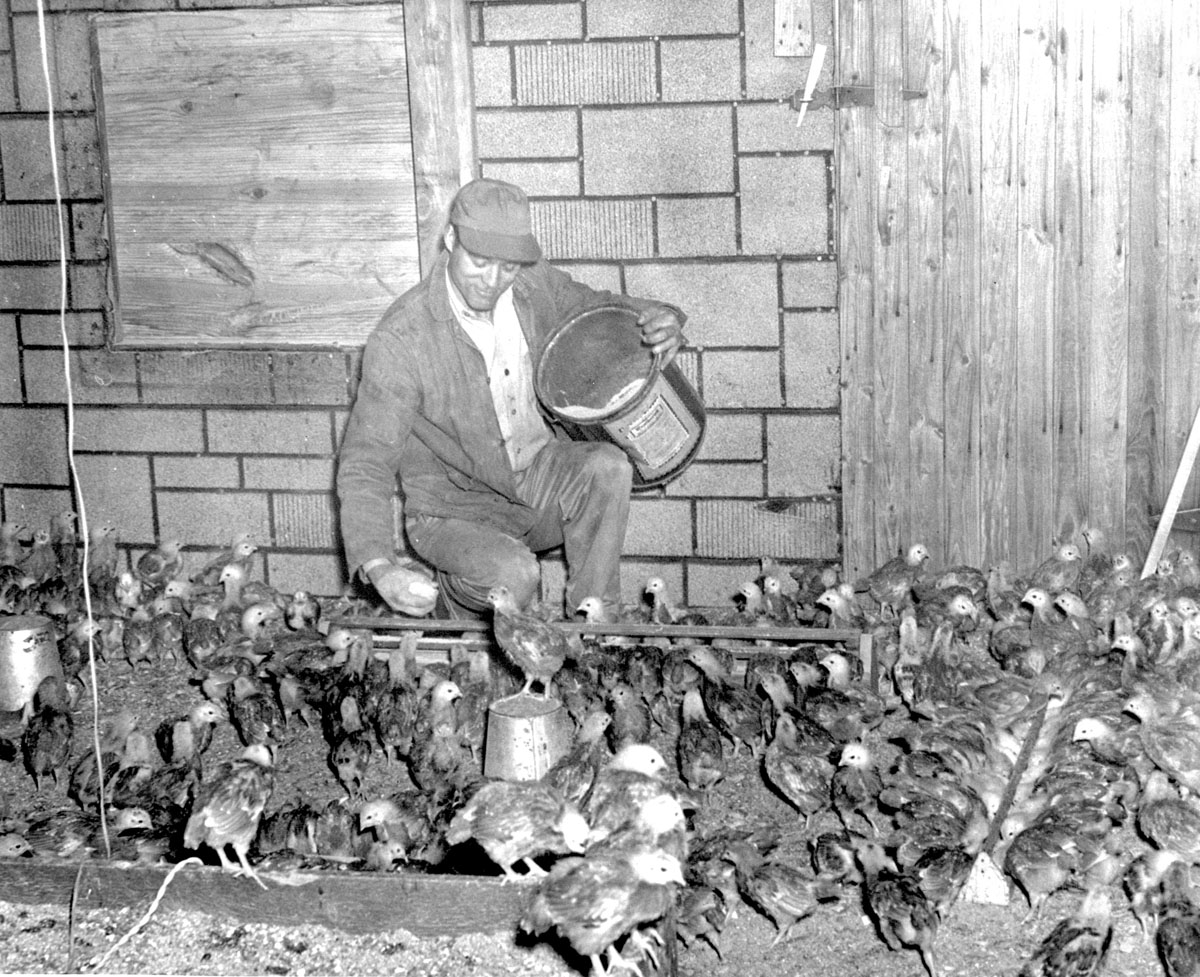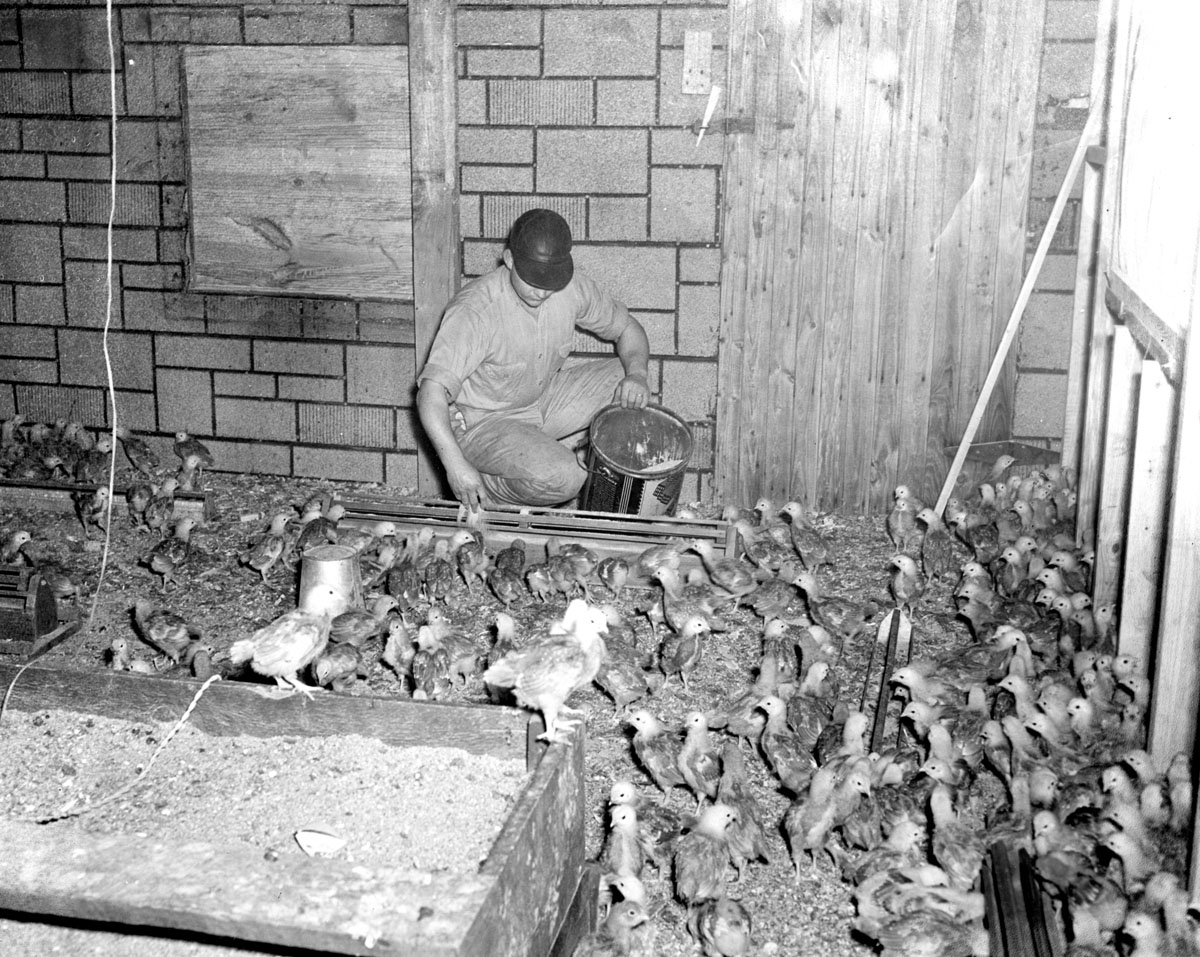 - William Hayes feeding new chicks. 08b 64_life_work_general_farm_grounds_sorghum_008b