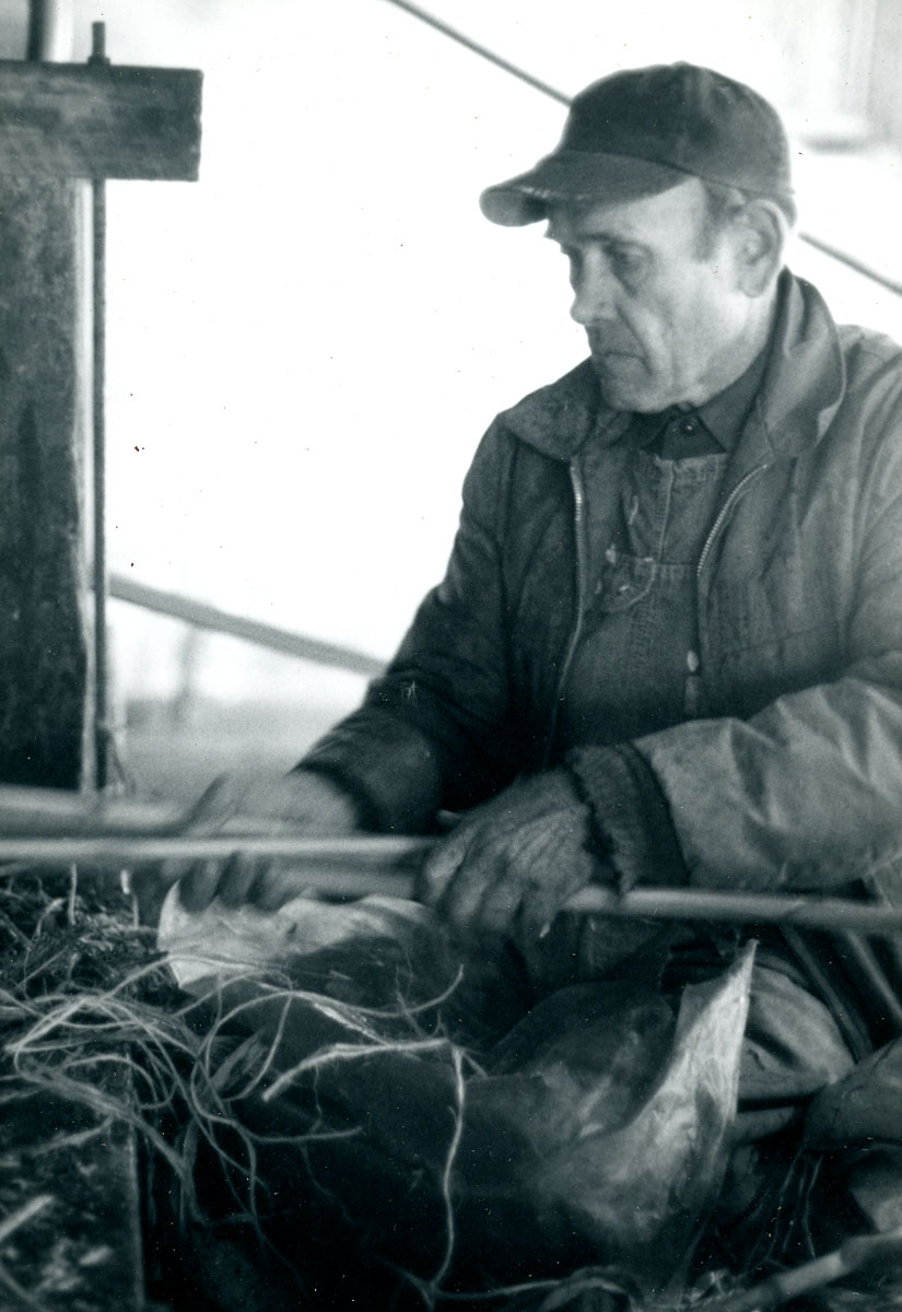 - William Hayes, farmer, and new chicks. 05a 64_life_work_general_farm_grounds_sorghum_005a