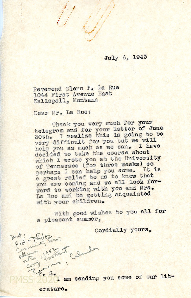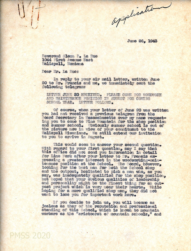 [07], [07a] June 26, 1943.Two-page letter to LaRue from [unsigned], restating the words of a telegram offering LaRue the woodwork and maintenance position for the school year beginning in August. “Obviously summer school is out of the picture now in view of your commitment to the Kalispell Kiwanians.” The Board was slow to decide because it had hoped he would be interested in the “outpost” position instead, due to LaRue’s “obvious qualities of leadership and personality.” Mentions the “reputation and professional standing [of PMSS] which is known to mountain workers as the ‘aristocrat of mountain schools,’ and which rated the whole of Chapter 4 in the eighteen chapters of Spear’s ‘Emerging High School Curriculum’ (American Book Co., 1940). Encloses a list of the furniture in the house; explains the salaries. Will allow $100 for travel expenses, using the July salary for a woodworking instructor.