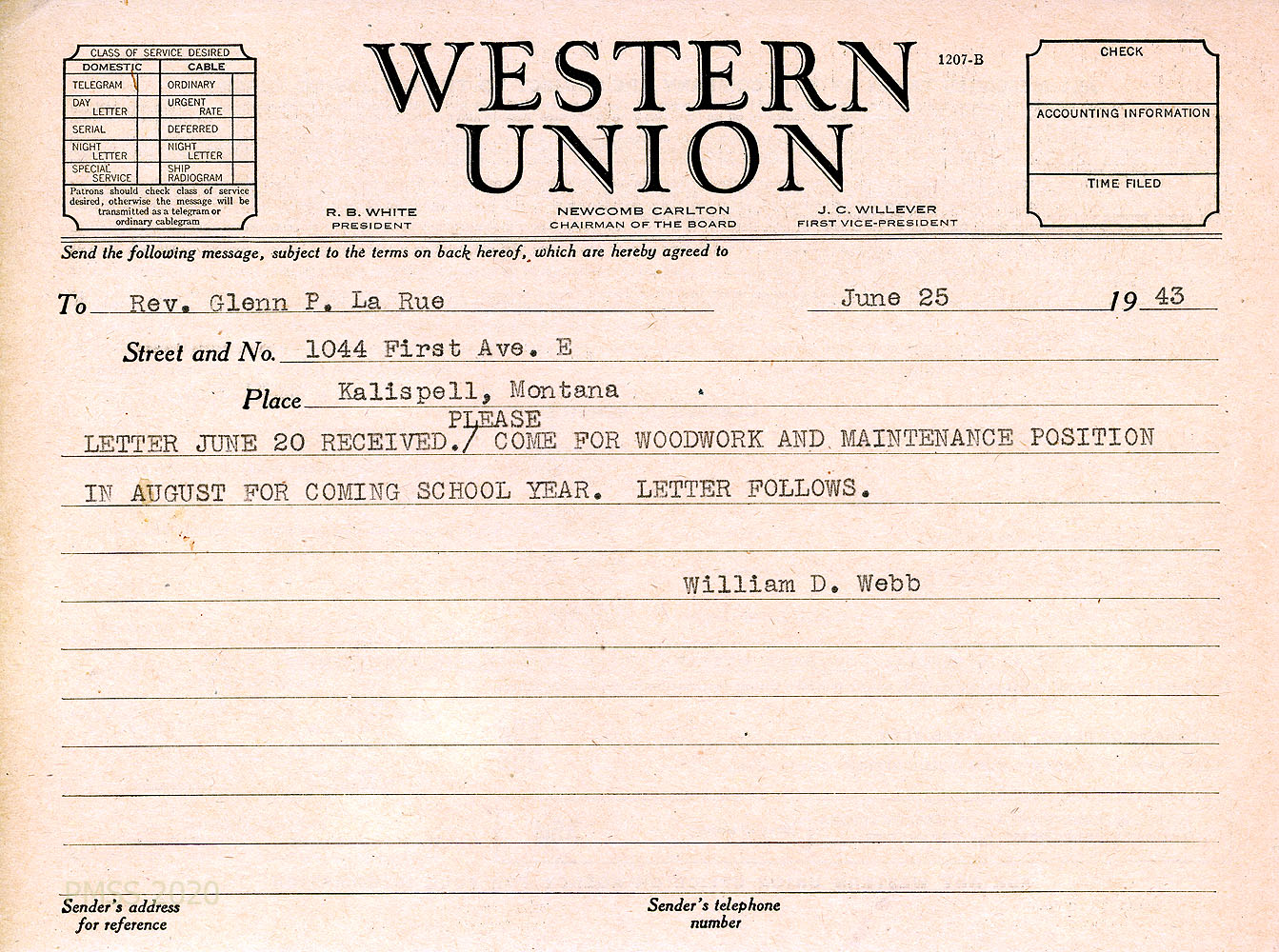 [12] June 25, 1943. Western Union telegram to LaRue from Webb, offering woodwork and maintenance position.