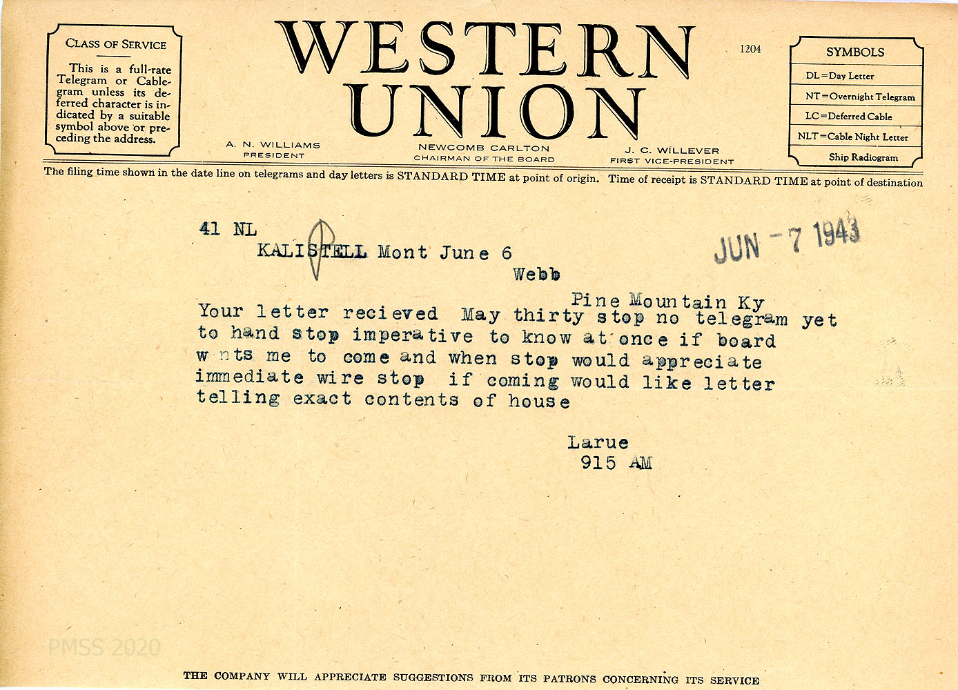 [14] June 4, 1943. Western Union telegram to Webb from Wells, stating that the Appointment Committee prefers that LaRue takes the Line Fork position.