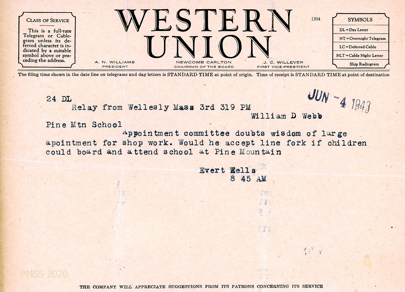 [26], [26a] July 22, 1943. Two-page letter to Mr. and Mrs. LaRue from Webb. Contract between PMSS and the LaRues concerning employment for Mr. LaRue (Woodworking Instructor and maintenance man, August 20, 1943 – June 30, 1944 at $100 a month) and Mrs. LaRue (beginning September 1, 1943, as Relief Nurse at $25 a month; including meals at Laurel House, housing at Farm House, laundry and ironing, tuition for the three children, a month’s summer vacation with pay, free Sundays and two weekends each semester. Signed, Webb, Dorothy W. LaRue, Glenn P. LaRue, and Evelyn K. Wells (Chairman of Personnel Committee).