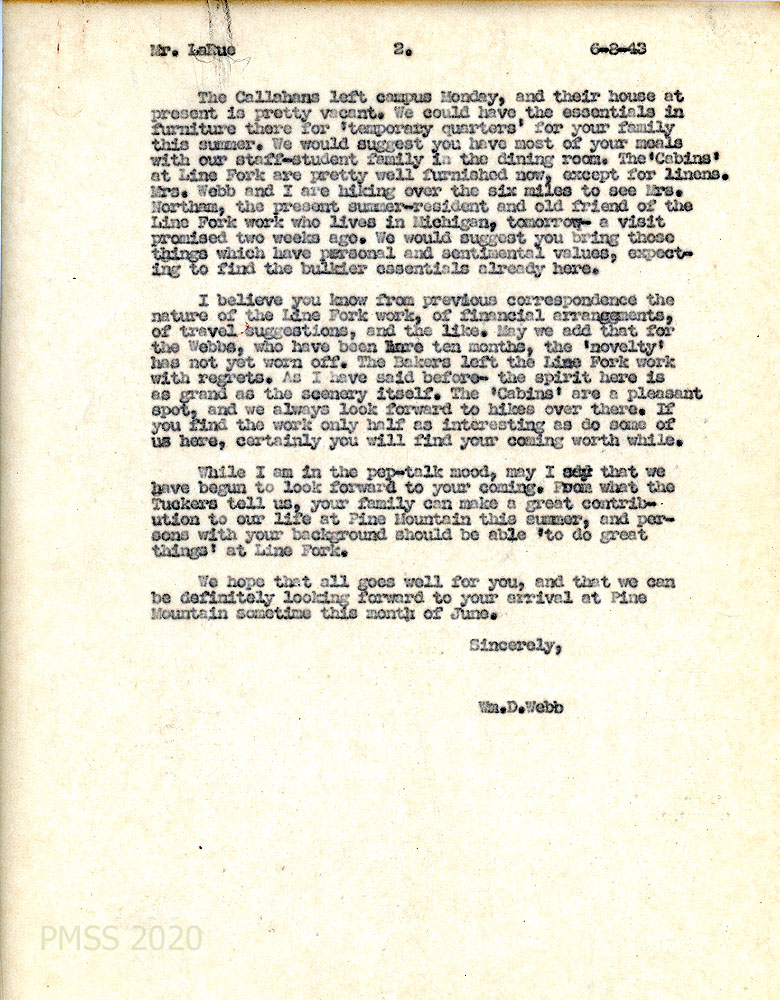 [17], [17a] June 8, 1943. Two-page letter to LaRue from Webb. Restates LaRue’s 5/30 telegram and Webb’s 6/8 telegram; asks him to come to PMSS now, “no matter which direction your service here would take” and gives the reasons for and advantages of this suggestion. Describes arrangements for temporary summer quarters for the family; dining room meals; what to bring. He and Mrs. Webb plan to visit “Mrs. Northam, the present summer resident and old friend of the Line Fork work who lives in Michigan.” Assures LaRue that “the spirit here is as grand as the scenery itself.” He hopes to see LaRue in June.