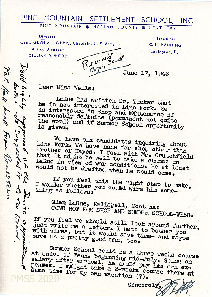 [19] June 17, 1943. To Wells from Webb. [Notation at top of page: “Revised copy sent.”] Reports that LaRue wrote Tucker that he prefers the Shop and Maintenance position rather than Line Fork. Although PMSS has 6 candidates for Line Fork, he feels “with Mr. [James] Crutchfield that it might be well to take a chance on LaRue in view of war conditions. He at least would not be drafted….” [Notation in left margin: “[Arthur] Dodd highly approved of the Smith(?) appointment…. (?) Hall back from Brasstown.”] Signed: Wm Webb.