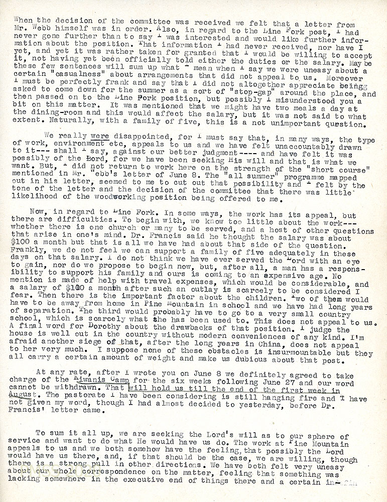 [20] through [20b] June 20, 1943. To Dr. Francis and Webb from LaRue, replying to a 6/14 letter from Francis. He explains why he and Mrs. LaRue decided not to go to Pine Mountain, feeling that the offer and arrangements for the position were too informal and unclear. He gives his reasons why he is dubious about working at Line Fork. Therefore, the LaRues took charge of the Kiwanis Camp for the summer and he is considering pastorate work at a church afterward. He asks for a definite reply to his questions.