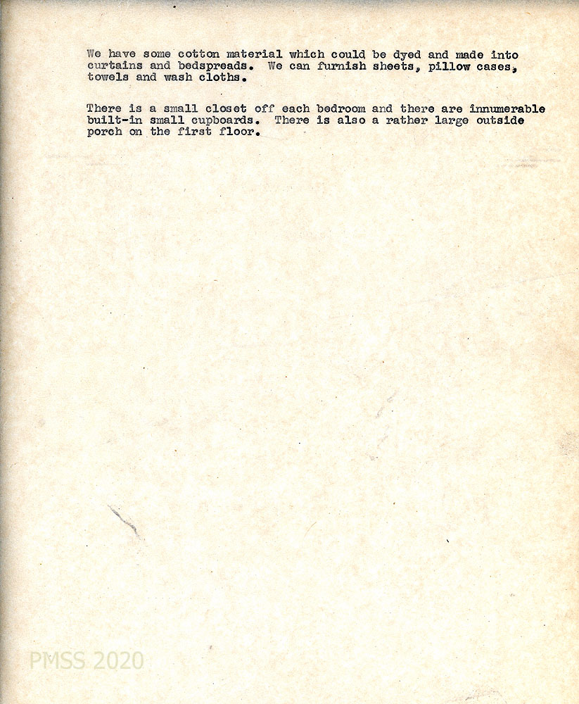 [23], [23a] N.D. Enclosure in [07], [07a] letter. A two-page list of “Furniture Available for Farm House.” Describes the building and the contents of each of the rooms.
