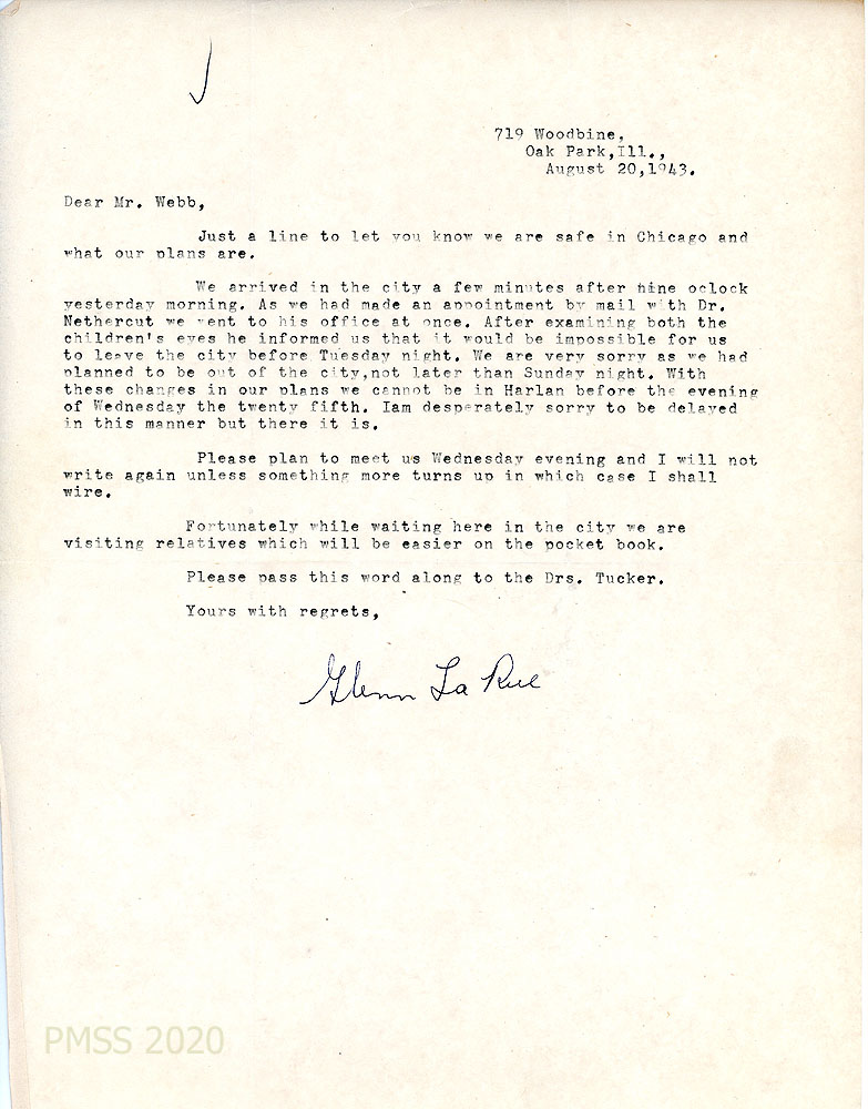 [29] August 20, 1943. To Webb from LaRue. The LaRues are staying with relatives in Chicago en route to PMSS, arriving at Harlan on August 25.