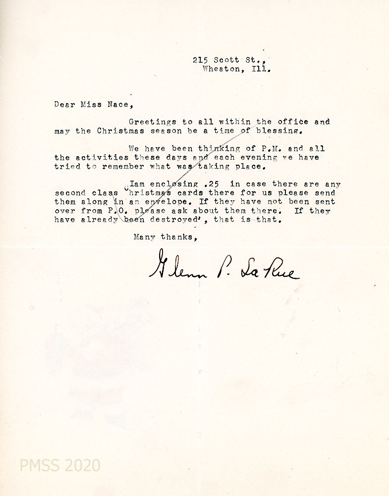 [34] N.D. To Miss [Dorothy] Nace, Secretary, from LaRue in Wheaton, IL, who sends Christmas greetings; asks that she forward to him any Christmas cards sent to the LaRues. “We have been thinking of P.M. and all the activities these days and each evening we have tried to remember what was taking place.”