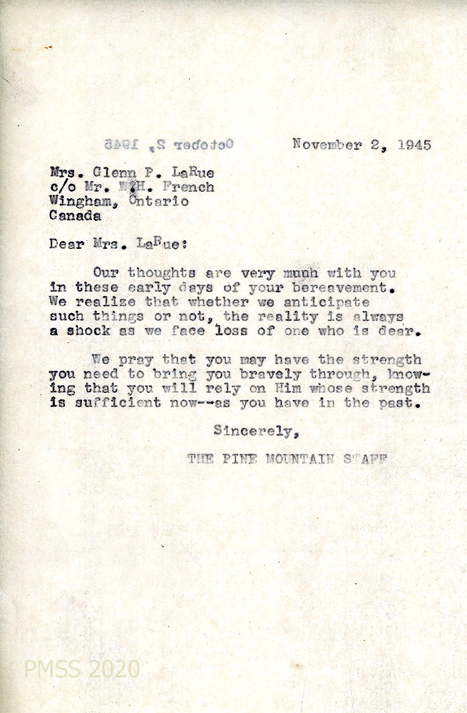 [35] November 2, 1945. To Mrs. LaRue, c/o, Mr. W. H. French, in Wingham, Ontario, Canada, from “The Pine Mountain Staff,” sending condolences for her loss.