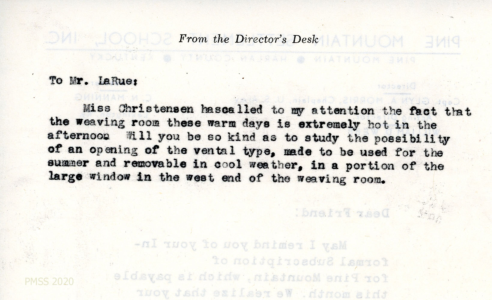 [40] N.D. A note to LaRue “From the Director’s Desk,” asking if he could install a vent in a window of the weaving room, per complaint from Miss Christensen that the room is too hot in the afternoon.