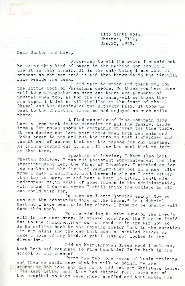 [41], [41a] January 20, 1952. Two-page letter to Burton and Mary [Rogers] from LaRue in Wheaton, IL, who thanks them for the book of Christmas carols with drawings. “I find memories of Pine Mountain days have a [prominence] in the memories of all the family. Aside from a few rough spots we certainly enjoyed the time there. It was during our last year there when both Benjamin and Dodds began to try and put the curb on what I preached and taught and of course that was the reason for our leaving. As things turned out it was all for the best that we left at that time.” LaRue tells of this time as assistant superintendent at Wheaton College and why he has left. Now that the children no longer need them, Mr. and Mrs. LaRue are wondering if they should return to the foreign missionary field. Gives updates about his sons, Jerry (in basic training) and Bob (also in the armed forces). Asked if it was true that Earl Lewis from First Creek was killed in Korea.