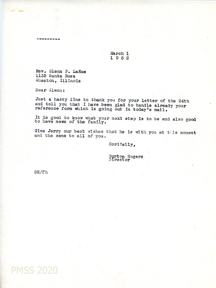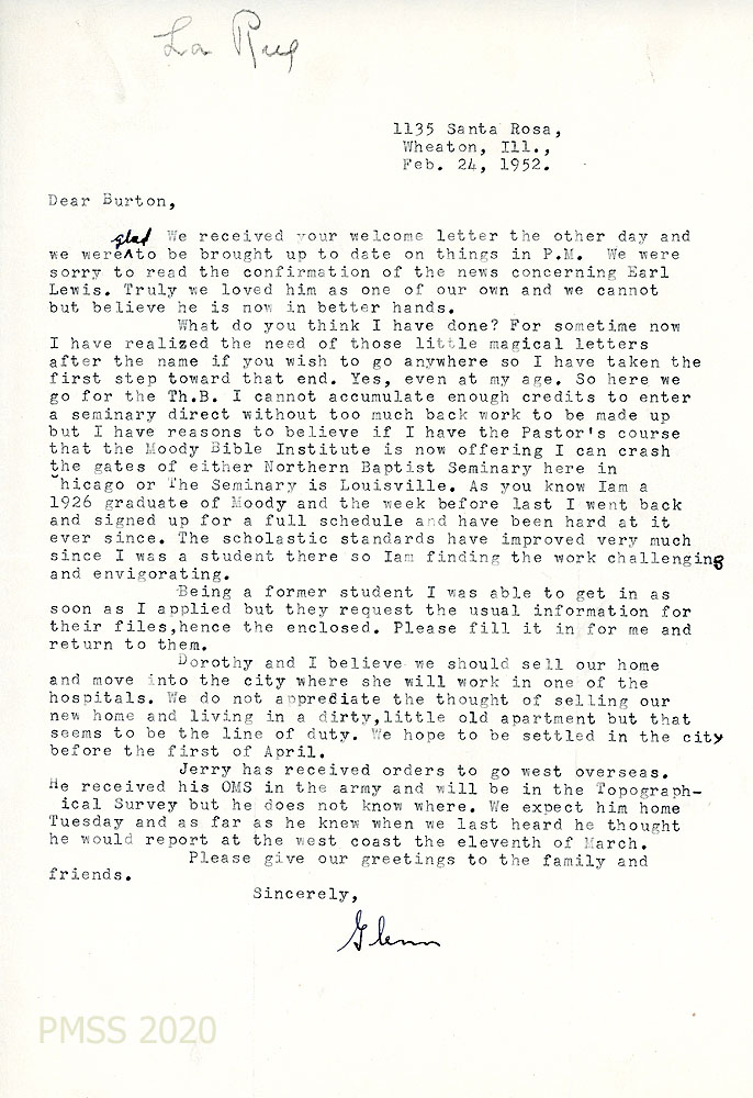[44] February 24, 1952. To Rogers from LaRue, who is now working to earn a Th.B, beginning with a pastor’s course at the Moody Bible Institute, then moving on to a seminary; encloses a request from Moody for information about LaRue. He and Dorothy plan to sell their house and move to the city by April 1. Gives an update about Jerry, who received his OMS in the army and will be in the Topographical Survey. He has received orders to go west overseas.