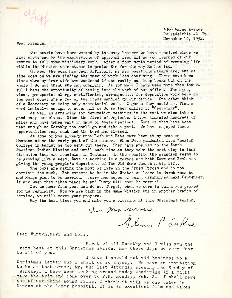 [46], [47] November 19, 1952. To “Friends” from LaRue in Philadelphia, PA, [46] who, with his wife, has returned to full-time missionary work as a Secretary handling visas, passports, clergy certificates, arranging for deputation work, etc.; he travels to take part in deputation meetings. Gives updates about his children: Beth has a new baby. She and her husband Dave have applied to the South American Indian Mission. Both sons are still in the armed forces and have plans to marry. [47] On the same page as [46]. To “Burton, Mary and Boys” from LaRue. He will be at Lost Creek, KY, in January and asks to show a sound film about the China mission (“Flower of Tibet”) to PMSS and in Harlan.