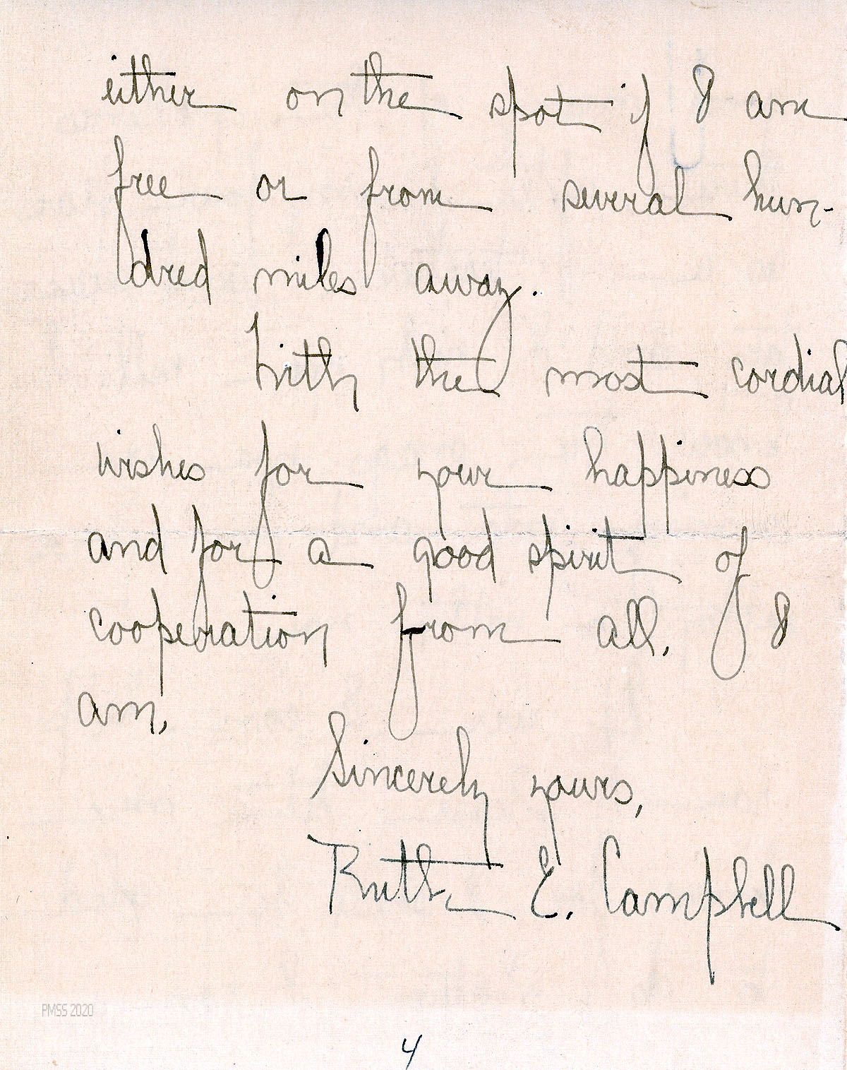 [Note: Letters from PMSS staff in the PMSS Collections are carbon copies, typewritten, unsigned, and meant for the Office files. The original signed copies were sent to the correspondents. The initials at the bottom left of most PMSS letters indicate the writer (along with the initials of the secretary). For example, “GAM” or “GM” refers to Glyn A. Morris, Director. Letters from Ruth Elizabeth Campbell are handwritten unless specified otherwise, and original. The following list of contents is in chronological order and not necessarily in the order of the image numbers.]