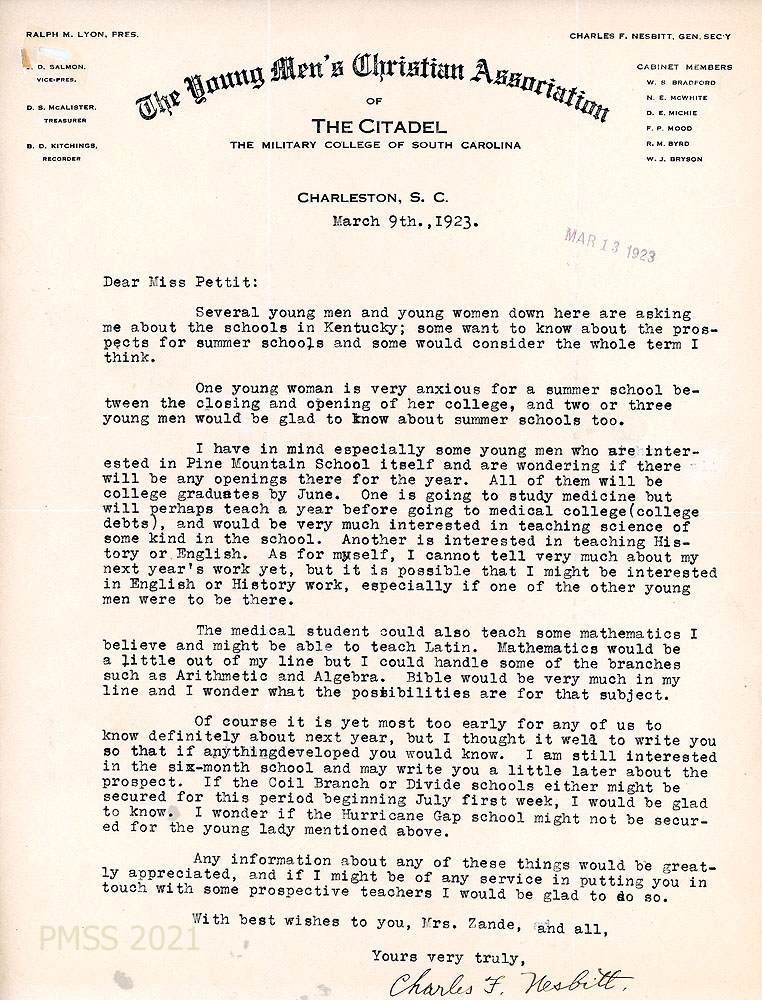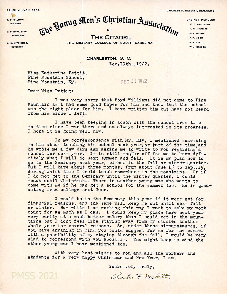[002] December 19, 1922. Two-page typewritten letter to Katherine Pettit from Charles F. Nesbitt on letterhead for “The Young Men’s Christian Association of The Citadel, The Military College of South Carolina, Charleston, S.C.” at which he is the General Secretary. He regrets that Boyd Williams did not attend PMSS; follows the progress of PMSS; plans to attend the Seminary in fall or winter 1922 and has time beforehand when he “could teach somewhere in the mountains.” He cites financial reasons for not attending the Seminary this year. Mentions another young man who is also interested in PMSS.