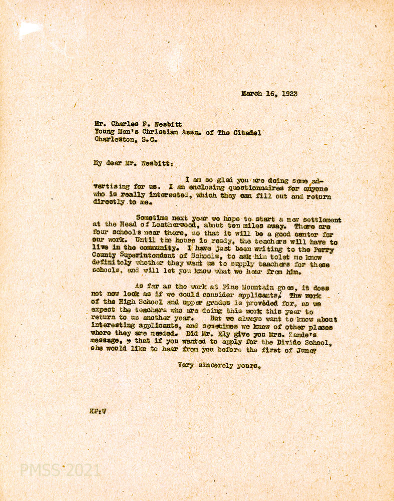 [005] March 26, 1923. To Nesbitt from KP (Pettit). Encloses questionnaires for those interested in applying; describes plans to “start a new settlement at the Head of Leatherwood, about ten miles away.” She is asking the Perry County Superintendent of Schools “whether they want us to supply teachers for [their four] schools” and will let Nesbitt know the answer. Pettit tells him there are no PMSS openings; Zande asks about his interest in applying for the Divide School.